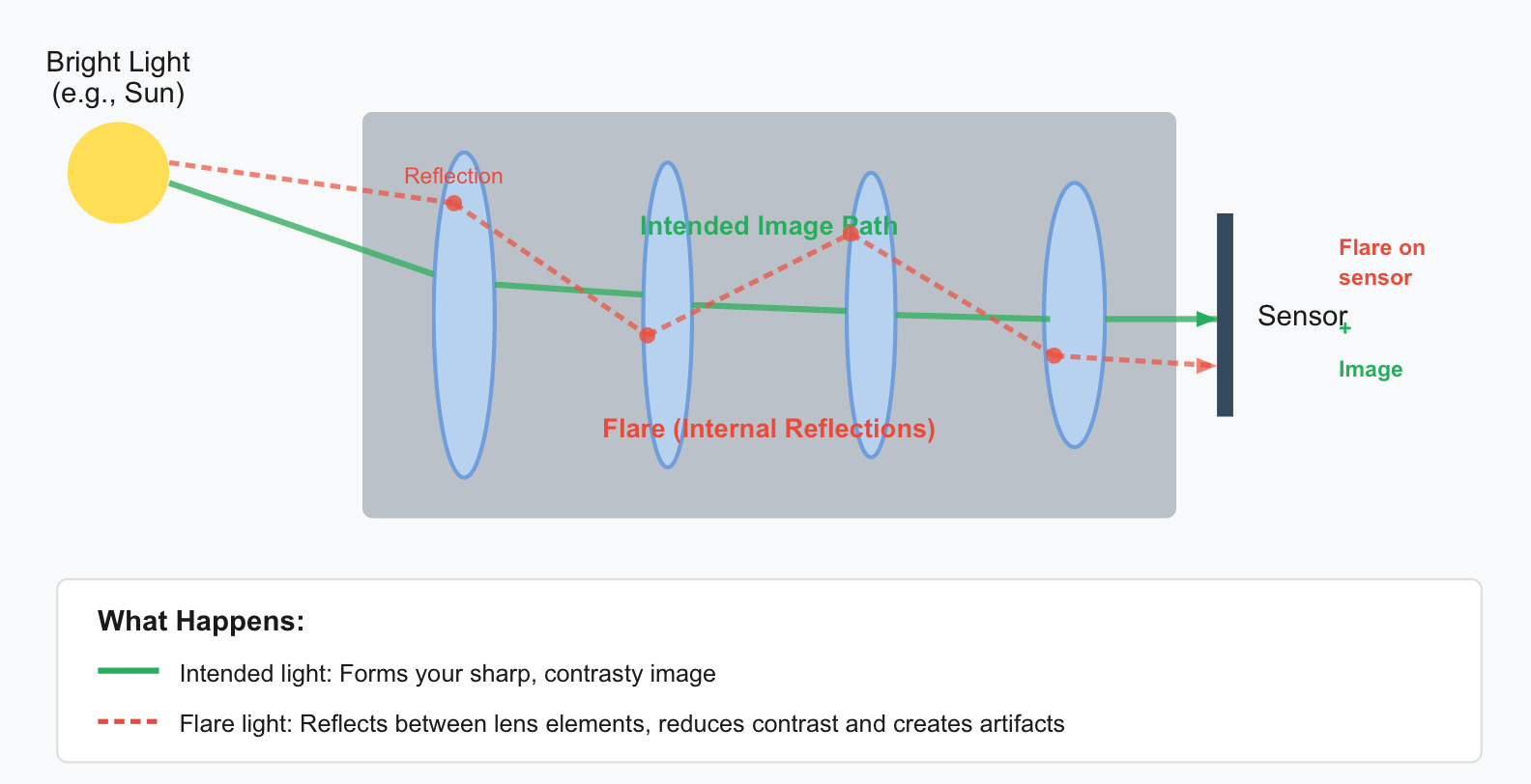 Most light passes through the lens elements properly to form your intended image Some light reflects off the surfaces between lens elements (even with anti-reflective coatings, 1-2% reflects at each air-glass interface) These reflections bounce around inside the lens barrel, creating secondary light paths This scattered light reaches the sensor, adding unwanted exposure